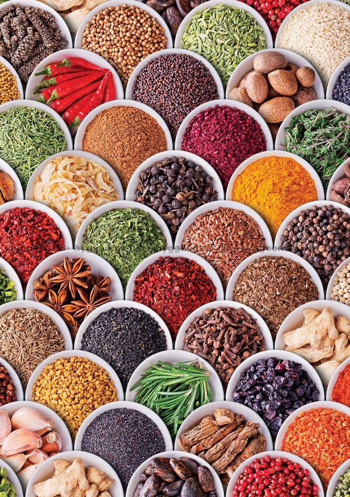 - Vakker samling av boller fylt med ulike krydder og urter. Hver bolle er nøye arrangert slik at de danner et fargerikt mønster