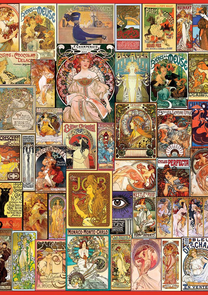 - Collage med vakre art nouveau-plakater fylt med detaljer og farger
