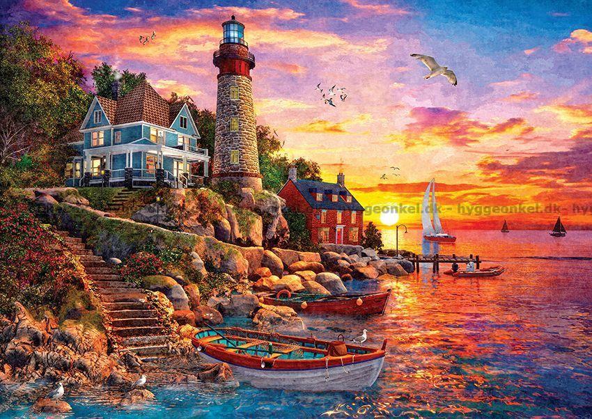 - Fyret står på klippen. Ved siden av fyret ligger et koselig blått hus