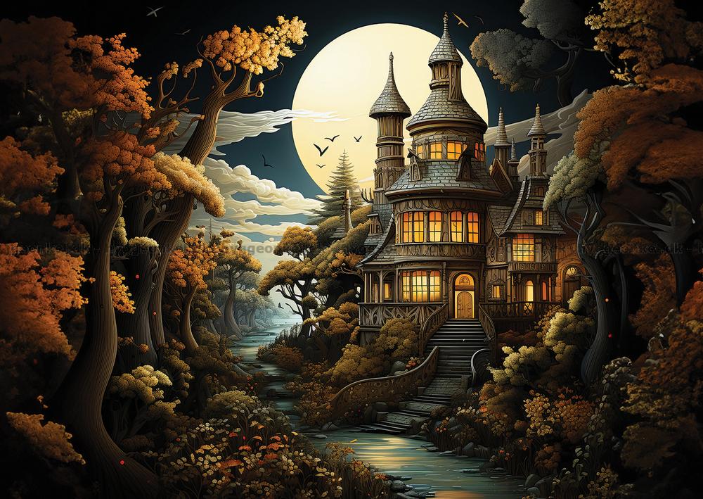 - En stor, lysende fullmåne henger lavt på himmelen, og dens skjær reflekteres i de omkringliggende trærne og den stille elven som slynger seg gjennom landskapet. Trærne rundt paléet er i varme høstfarger.