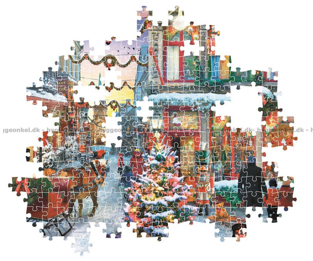 - Sleden trukket av hester beveger seg gjennom den koselige julepyntede gaten