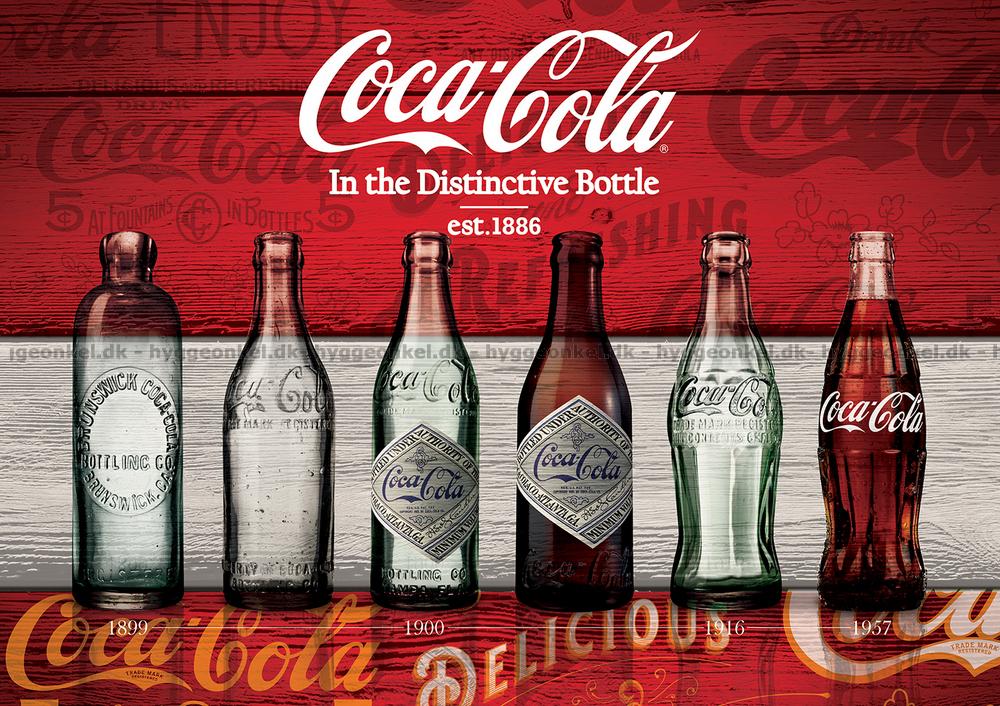 - Coca Cola-flasker gjennom tidene på en bakgrunn med røde og hvite striper. Flaskene representerer ulike årstall og design, som illustrerer utviklingen av Coca Cola-flaskens ikoniske form