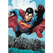 - Supermann i full fart over de høye skyskraperne. Han er iført den ikoniske blå drakten med den røde kappen flagrende bak seg