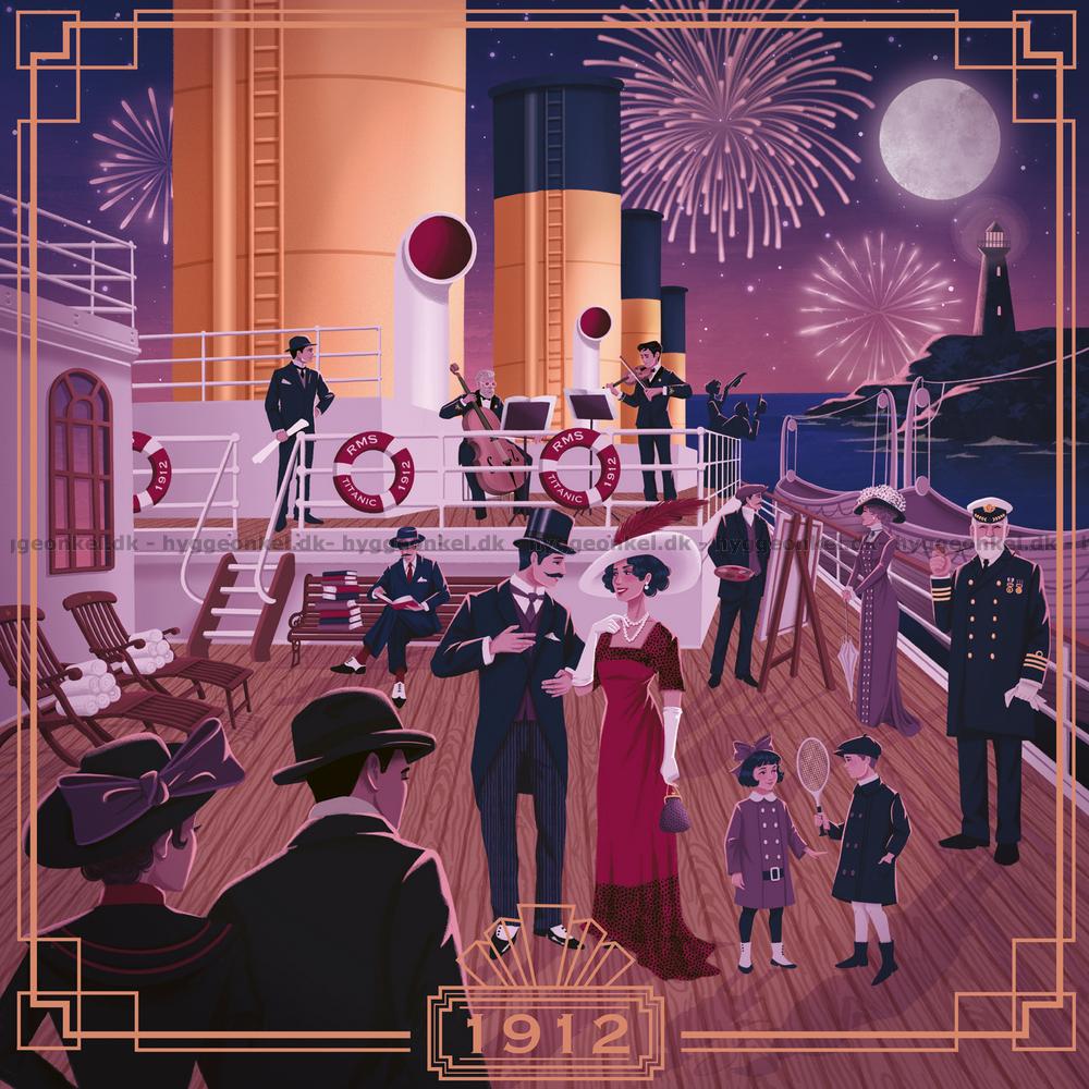 - Passasjerene nyter en festlig stemning under den stjerneklare himmelen. Fyrverkeri lyser opp nattehimmelen, mens en stor fullmåne kaster sitt skjær over havet