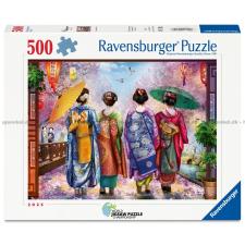 - Fire kvinner iført fargerike kimonoer står med ryggen til og ser ut over en blomstrende hage