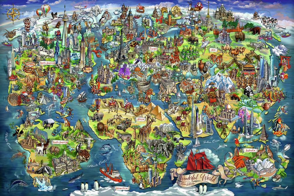 - Afrika er fylt med savannens dyr som elefanter og løver, samt de majestetiske pyramidene. Asia presenterer en blanding av moderne skyskrapere og tradisjonelle templer, med pandaer og tigre. Maria Rabinsky har tegnet motivet