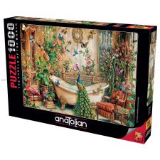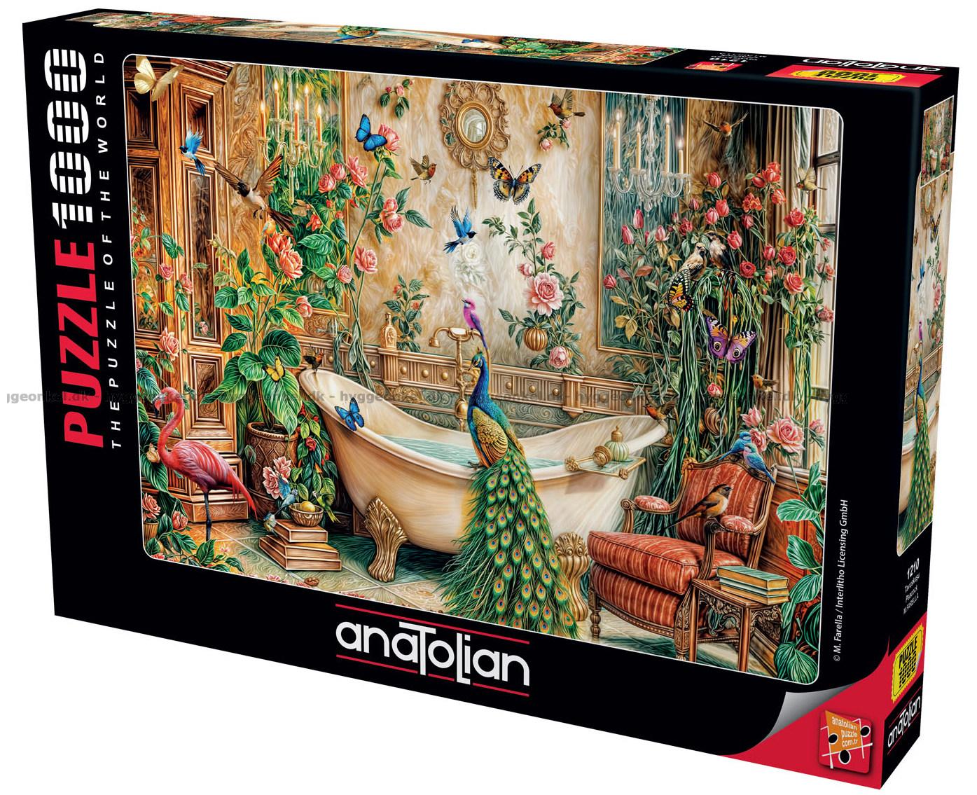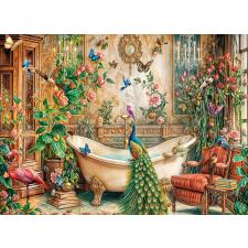 - Det overdådige badet er fylt med farger og liv. En majestetisk påfugl står ved et elegant badekar, omgitt av blomster og fugler