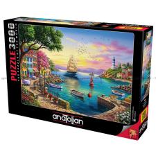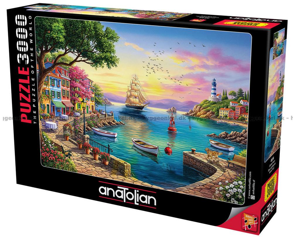 - Det flotte seilskipet ligger for anker ved den koselige kystbyen. Sola er i ferd med å gå ned i horisonten