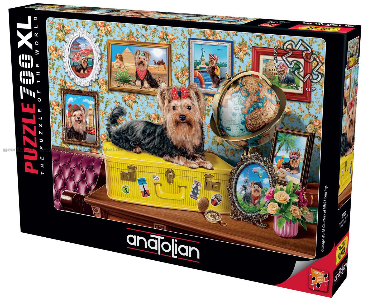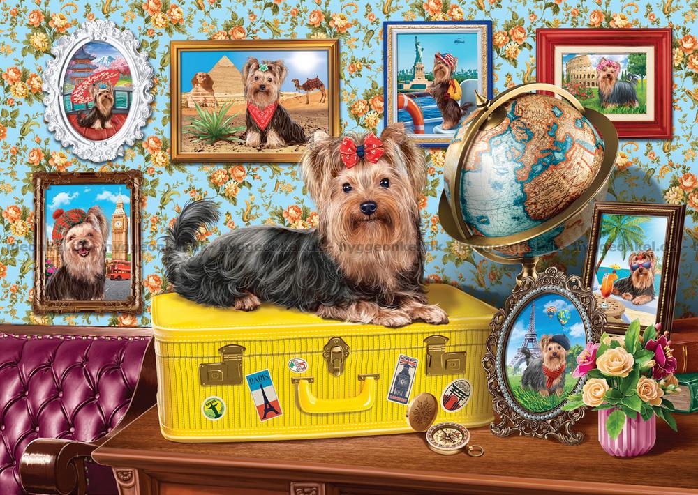 - Den sjarmerende Yorkshire Terrier sitter på en gul koffert omgitt av reiseminner og bilder fra hele verden