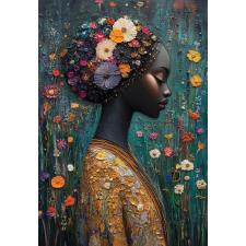 - Kvinnens hår er dekorert med en overflod av blomster i ulike farger