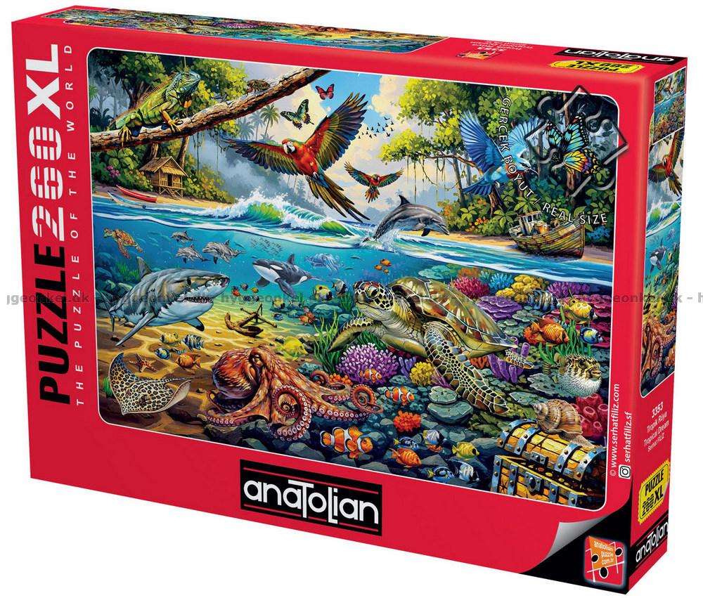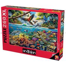 - I luften flyr fargerike papegøyer og sommerfugler. Under vannet er det et rikt dyreliv med en stor skilpadde som svømmer blant korallene