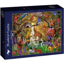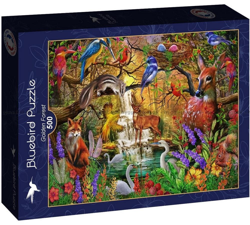 - I den spennende skogen står en hjort ved det lille fossefallet. I trekronene flyr vakre fugler i blå, røde og gule nyanser, og alt sammen er badet i et varmt gyllent lys