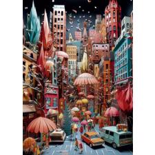 - Byen er fylt med papiraktige bygninger og trær. Gaten er fylt med mennesker som bærer fargerike paraplyer