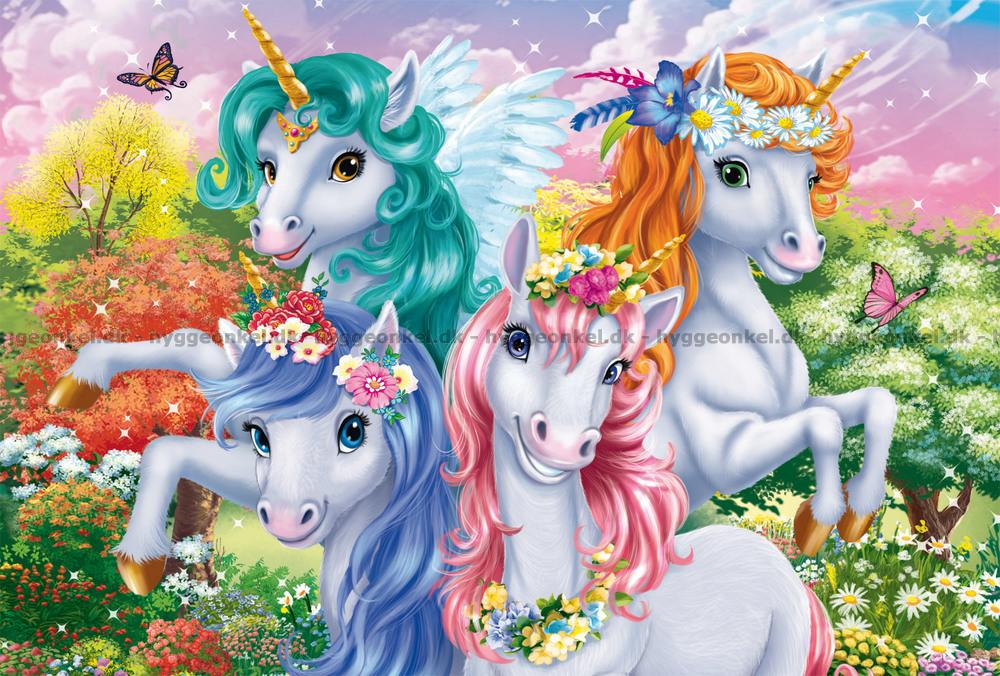 - De fire fargerike enhjørningene er omgitt av blomster og sommerfugler