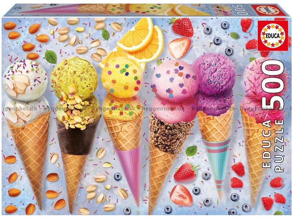 - Fargerike iskremkjeks med ulike smaksvarianter og dekorasjoner, omgitt av fersk frukt og nøtter