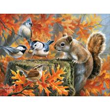 - Et ekorn og en rekke fugler har samlet seg ved trestubben, hvor alle kjemper om høstens siste nøtter