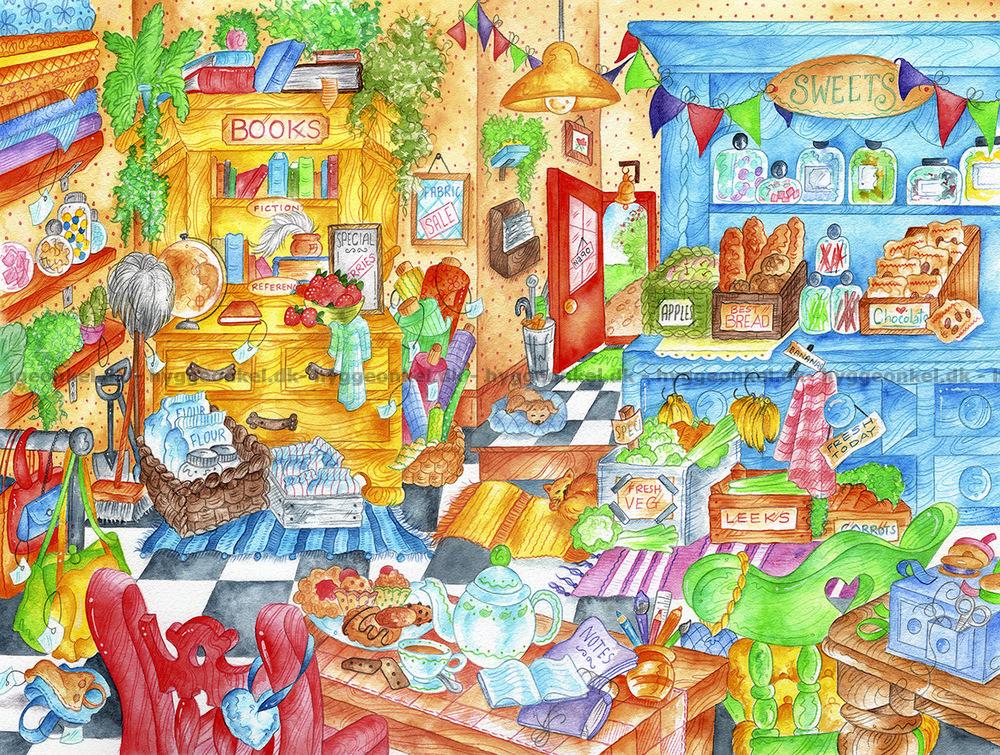 - Utforsk den spennende og fargerike butikken. Her finner du søtsaker, bøker og ferske grønnsaker