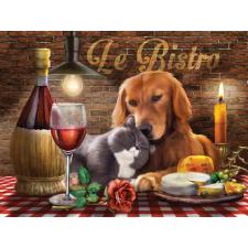 - Hunden og katten i skjønn forening ved bordet, som er fylt med vin og ost
