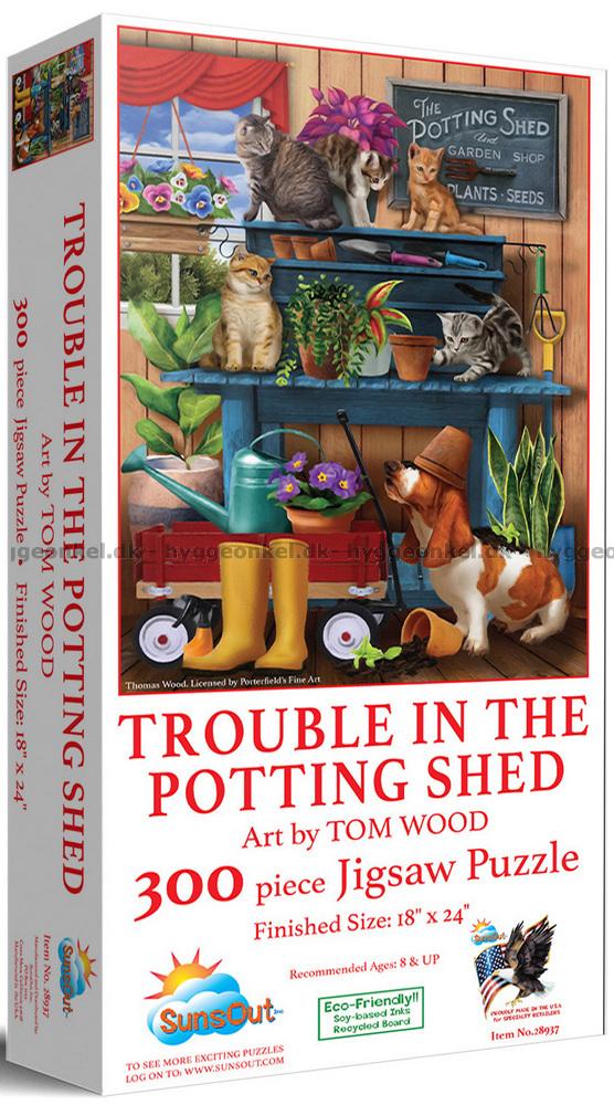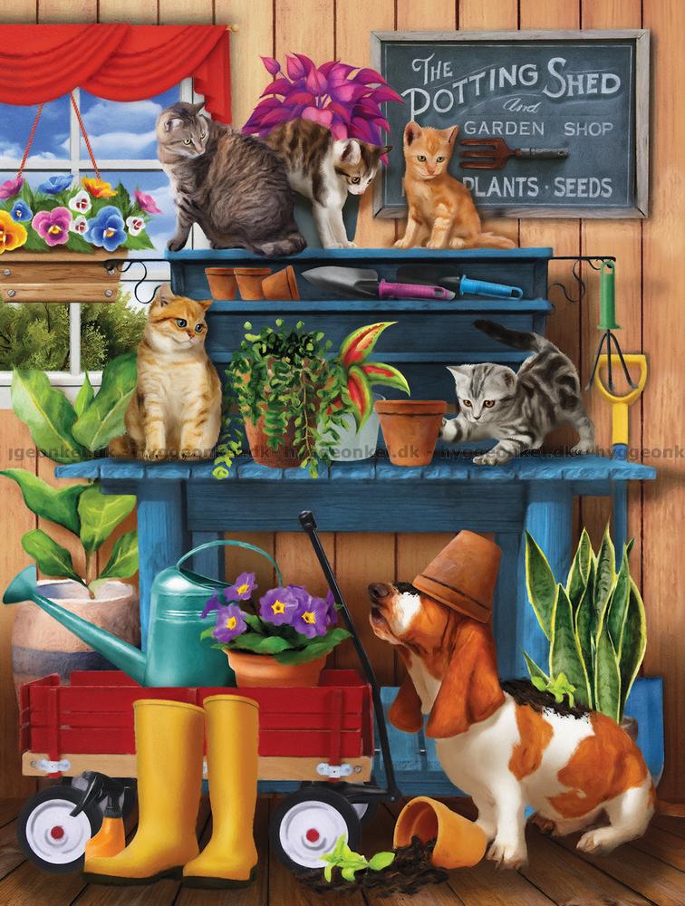 - I det koselige skuret er det fullt av liv og farger. Katter og hunden leker mellom blomster og hageredskaper