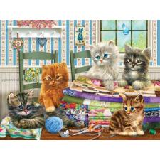- Kattungene er omgitt av fargerike stoffer, garn og sakser. Rommet innbyr virkelig til kreativitet