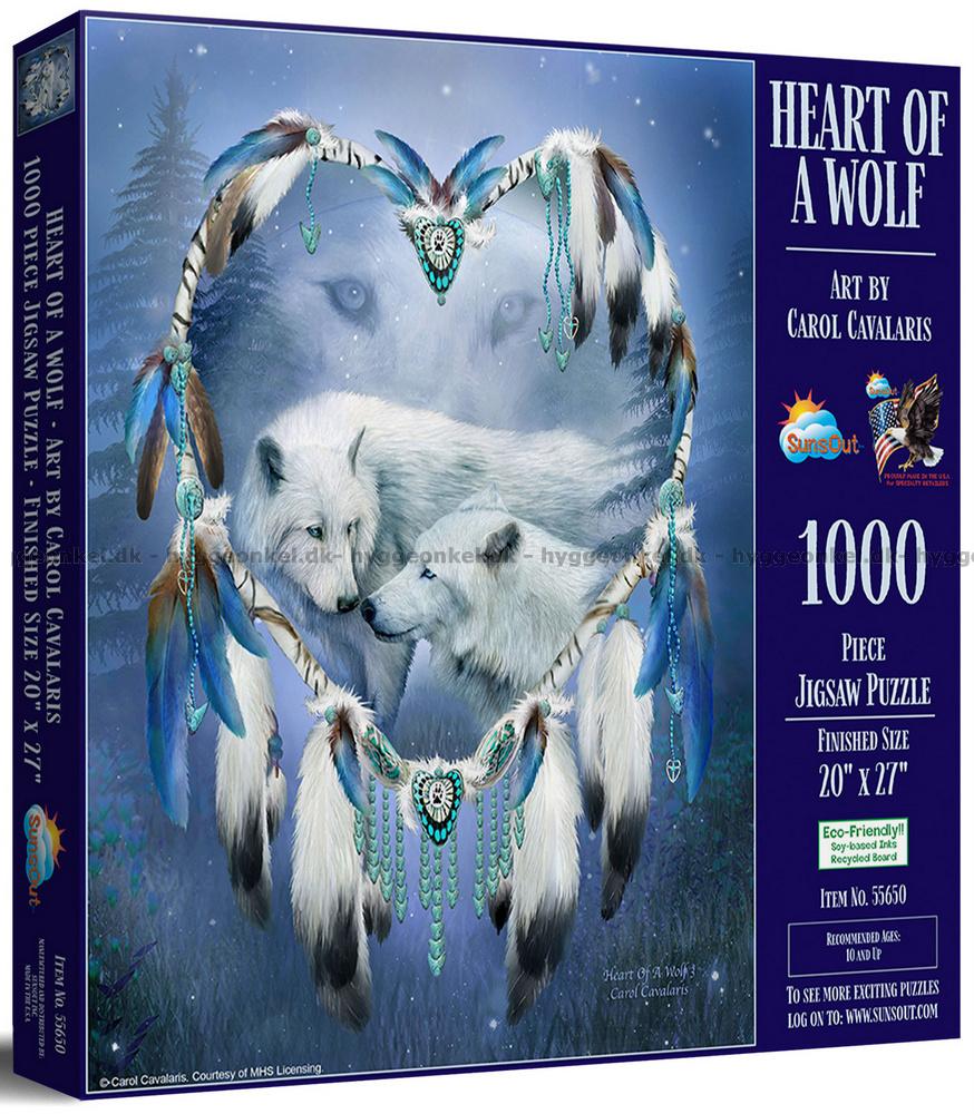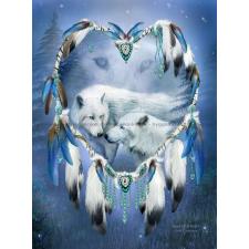 - To majestetiske hvite ulver står tett sammen i en drømmeaktig skogscene. De er omkranset av en stor drømmefanger som danner en hjerteformet ramme rundt dem