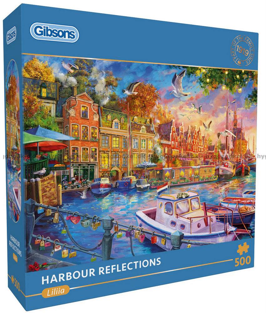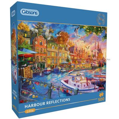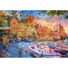 - Kanalen ligger badet i gyllent kveldssol, hvor fargerike bygninger speiler seg i det rolige vannet. En rekke små båter ligger fortøyd langs kaien