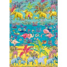 - Flamingoene slapper av omgitt av elefanter som beveger seg gjennom det fargerike landskapet