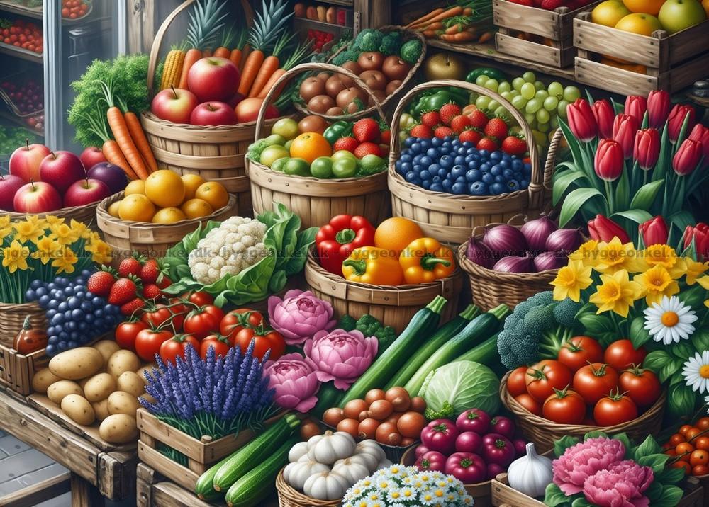 - Boden er fylt med friske frukter, grønnsaker og blomster