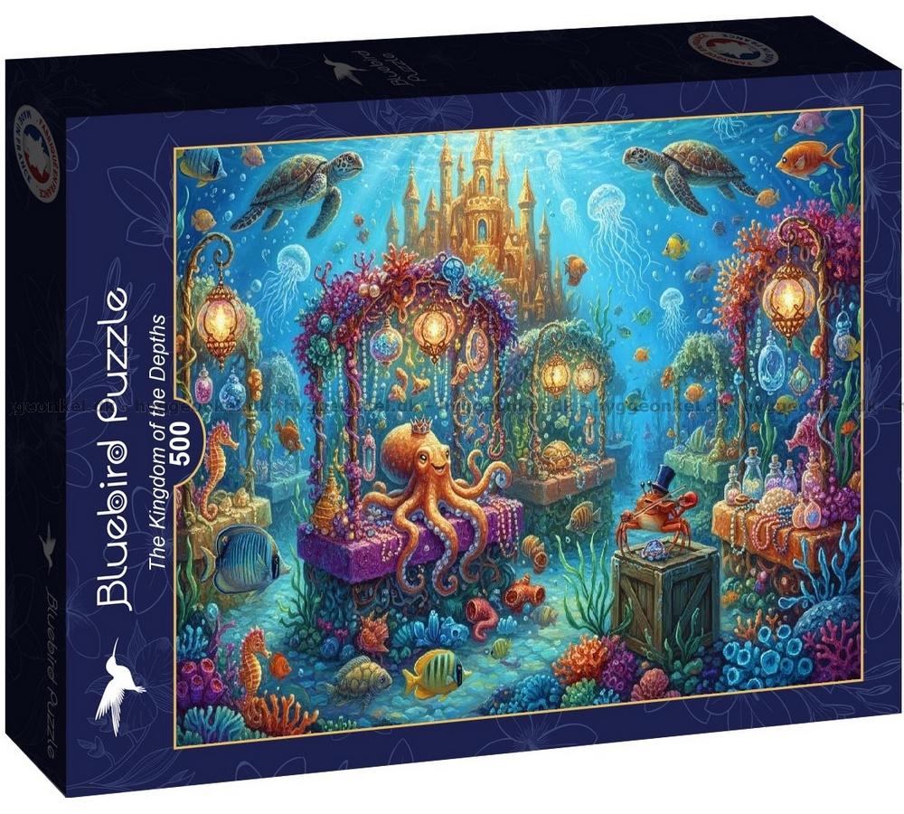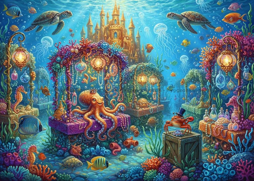 - Midt i den fargerike undervannsverdenen sitter en blekksprut på tronen med krone på hodet