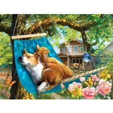 - Hundene ligger avslappet i hengekøyen i den koselige hagen