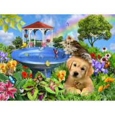 - Katten og hunden koser seg ved fuglebadet. En rekke sommerfugler flyr rundt og lander på blomstene
