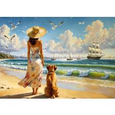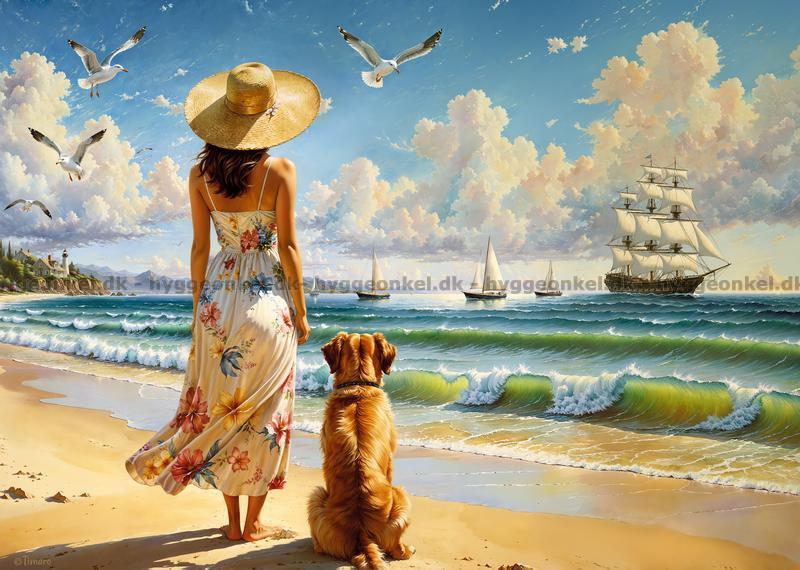 - På den solrike stranden står kvinnen med stor stråhatt og blomsterkjole. Ved hennes side sitter en hund