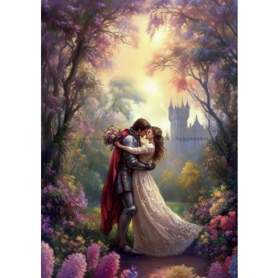 - Mannen står i sin rustning, mens kvinnen står i en hvit blondekjole. I bakgrunnen sees det imponerende slottet