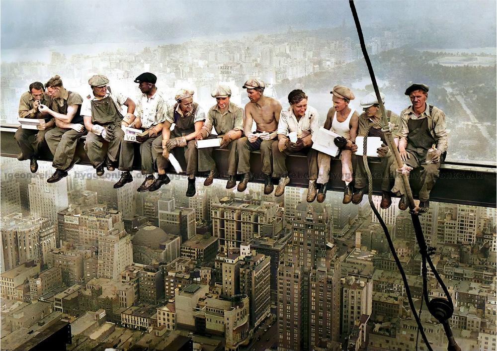 - Elleve bygningsarbeidere som tar seg en velfortjent pause fra dagens arbeid høyt over byens tak
