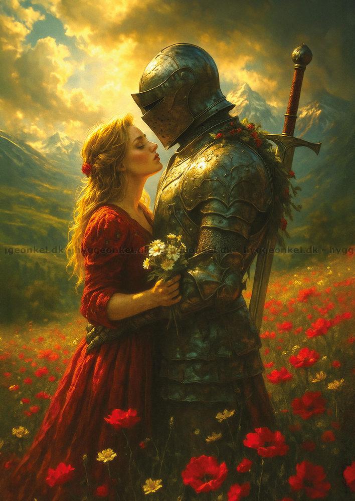 - Ridderen i skinnende rustning står tett på kvinnen i en rød kjole