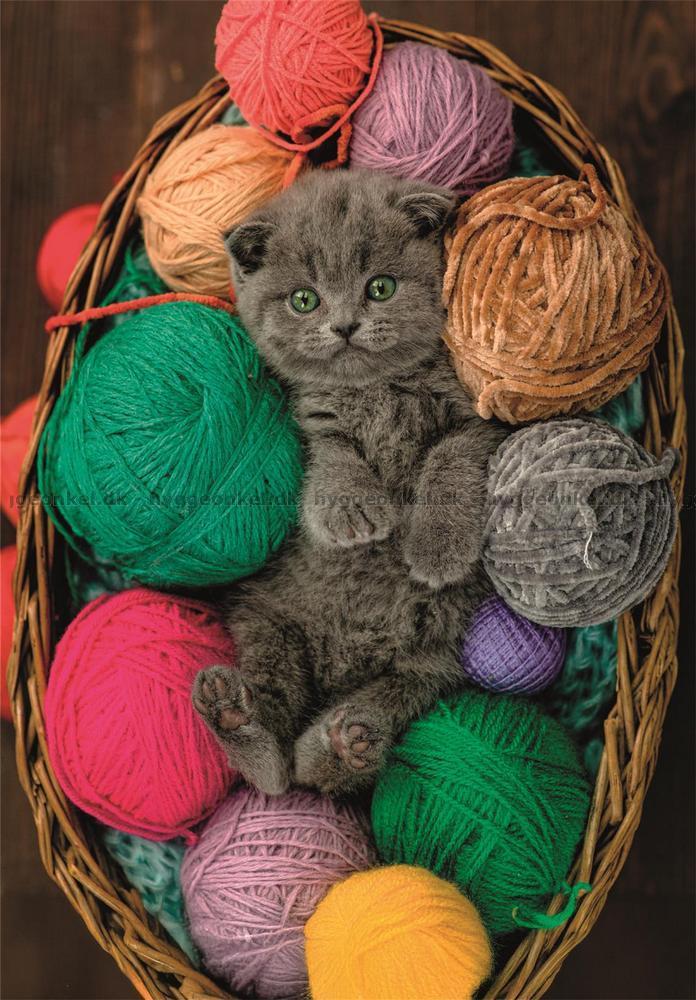 - Rundt katten ligger det en rekke store, fargede garnnøster