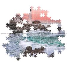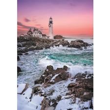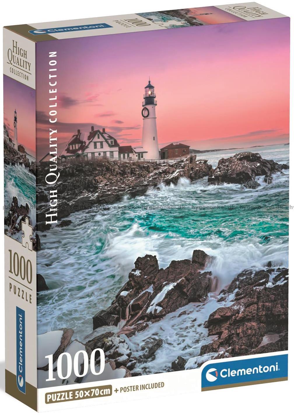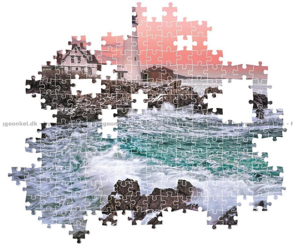 - Det hvite fyrtårnet står ved det dramatiske kystlandskapet med brusende bølger som slår inn mot klippene