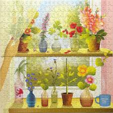 - Den solrike vinduskarmen er fylt med vaser og blomster i mange farger