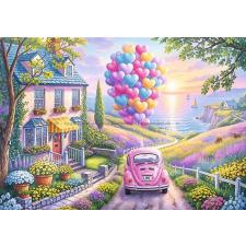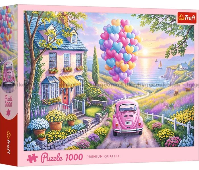 - Over bilen svever en stor bukett hjerteformede ballonger