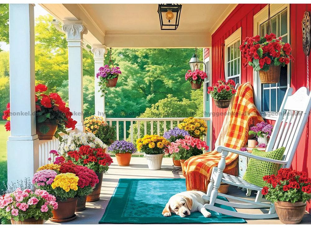 - Den koselige verandaen er fylt med blomster i alle regnbuens farger. En hund har funnet et godt sted å ta en lur
