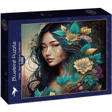 - Kvinnens hår flettes sammen med store blomster og frodige blader