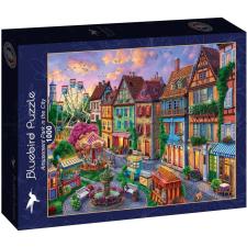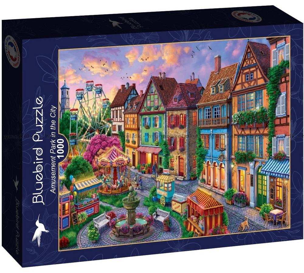 - Midt på plassen står en rund karusell med hester, omgitt av boder med stripete markiser og ballonger i klare farger