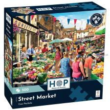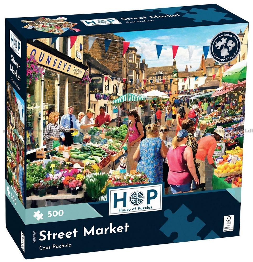 - Det livlige markedet er fylt med boder og kunder som er på utkikk etter blomster og grønnsaker