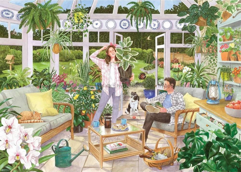 - Motivet er tegnet av Tracy Hall. Dette puslespillet har større brikker. Det betyr at når motivet er lagt, dekker det omtrent det samme som et vanlig 1000-brikkers puslespill