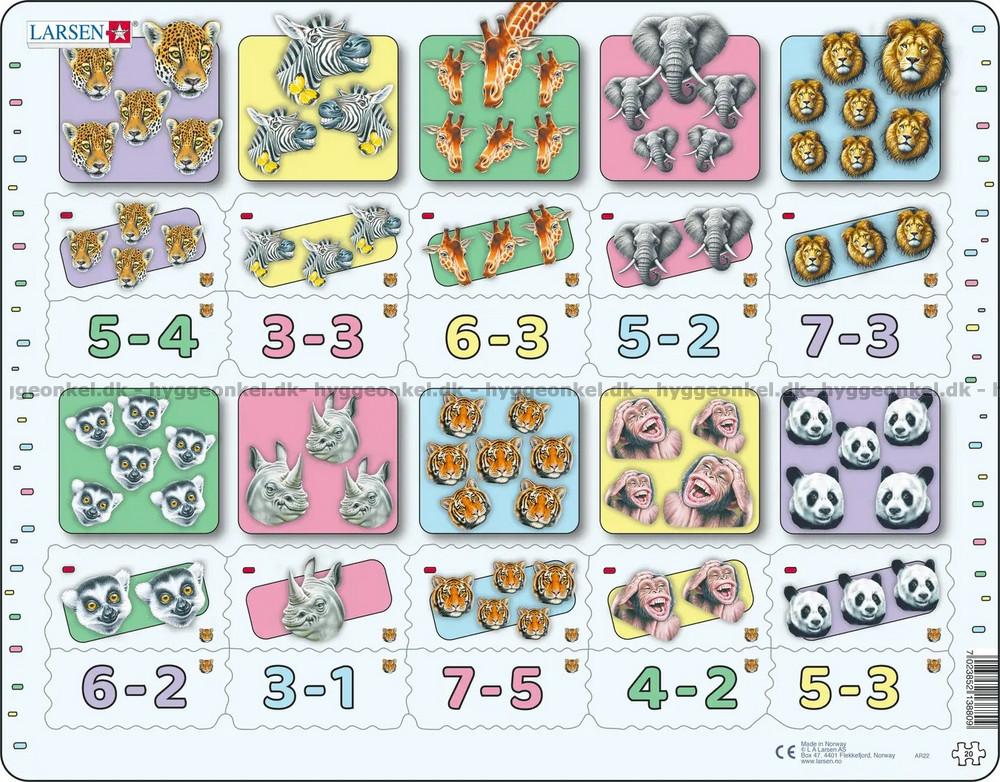 Matematikk: Minusstykker med ville dyr - Rammepuslespill, 20 brikker