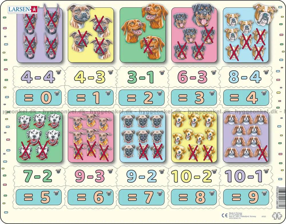 Matematikk: Minusstykker med hunder - Rammepuslespill, 20 brikker