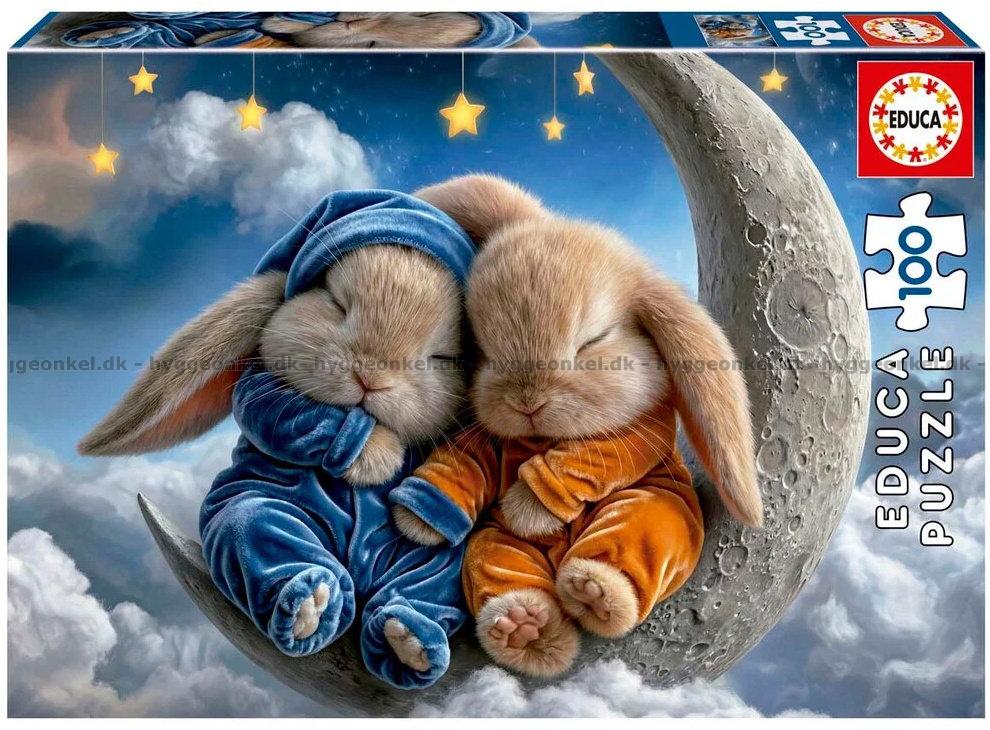 - De to søte kaninene sitter tett sammen og sover på en halvmåne omgitt av skyer og stjerner