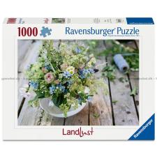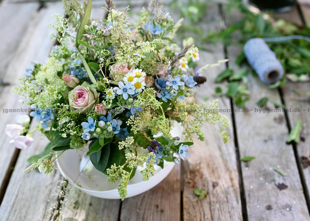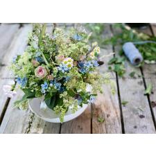 - Buketten består av ville blomster i lyseblå, hvite, lyserosa og grønne nyanser, blandet med fine gresstrå og blader