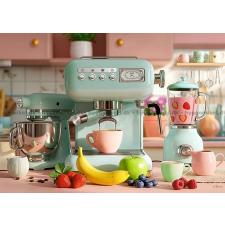 - Kjøkkenbordet er fylt med kjøkkenmaskiner, frukt og kopper i vakre pastellfarger