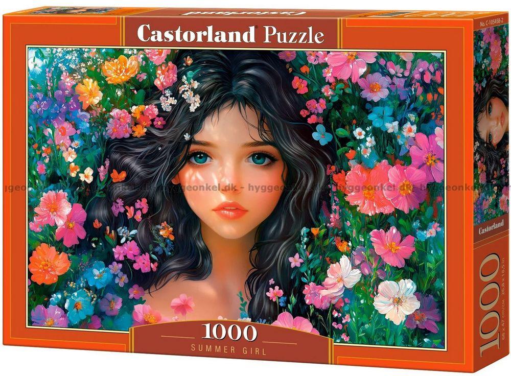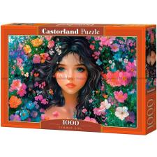 - Midt i et hav av fargerike blomster et kvinnelig ansikt med intense blå øyne og mørkt bølgende hår